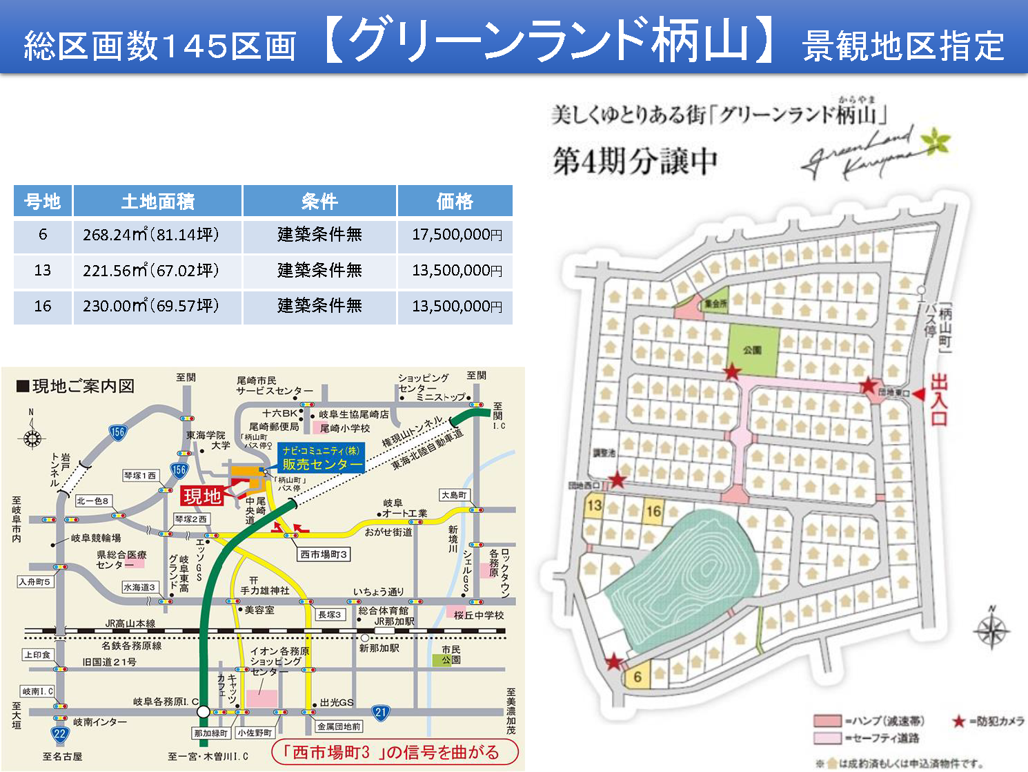 | ●所在地/各務原市那加柄山町154番10他 ●交通/JR東海道本線「岐阜」駅から岐阜バスで約30分、「柄山町」停下車約330m(徒歩約5分) ●開発面積/50,114.07㎡ ●開発許可/各務原市指令27建第1-0024号(平成27年4月3日)●総区画数/145区画 ●地目/宅地 ●都市計画法/市街化区域 ●用地地域/第1種低層住居専用地域 ●建ぺい率/60% ●容積率/100% ●私道負担/なし ●道路/幅員6m ●設備/公営上水道、公営下水道、中部電力、都市ガス ●造成工事完了/平成29年3月31日予定 ●その他費用/集会所設立基金:100,000円(入居時)、共用施設維持管理基金:10,000円(入居時)、水道負担金:165,000円、下水道受益者負担金:土地面積×500円(土地決済時)、自治会費:1,000円(月額)、防犯カメラ委託管理料:500円(月額)、トータルケアネット利用料:1,600円又は600円(月額)税別 CATV及びインターネット利用料は別途必要となります。 ●売主/ナビ・コミュニティ株式●今回販売区画/5区画 ●土地面積/221.56㎡~342.61㎡ ●販売価格/1,350万円~1,750万円 ●最多価格帯/1,350万円台(3区画) ※当分譲地は平成20年4月1日より、各務原市の景観地区指定を受けており、美しい街並と豊かな住環境を確保するため、建物や外構に関する街並基準を設けています。 |